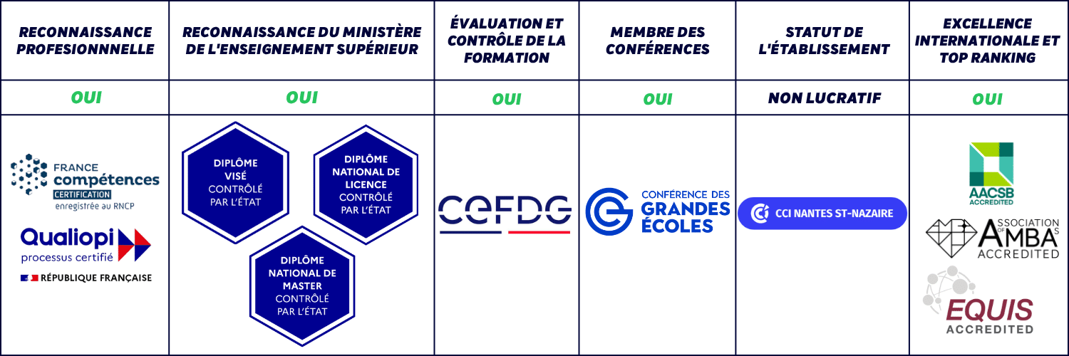 → Formations accessibles après un Bac, une L1, une L2, une L3 ou un Master. Audencia Business School est triple accréditée (EQUIS, AACSB, AMBA) et bien classée en France (SIGEM) comme à l’international (Financial Times).