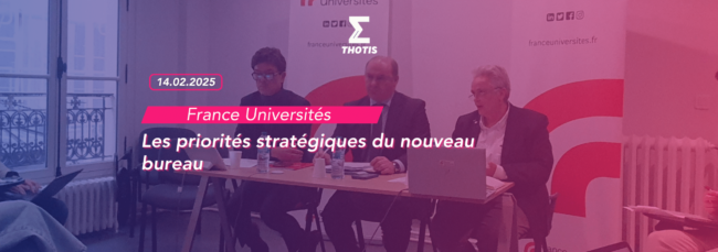 France Universités a dévoilé, à l’occasion d’une conférence de presse tenue le 11 février 2025, son nouveau bureau, élu le 30 janvier dernier. L’opportunité pour France Universités de partager les grands chantiers du prochain mandat. Au programme : liberté d’expression et libertés académiques, orientation en études supérieures et régulation du privé, vie étudiante, les finances…