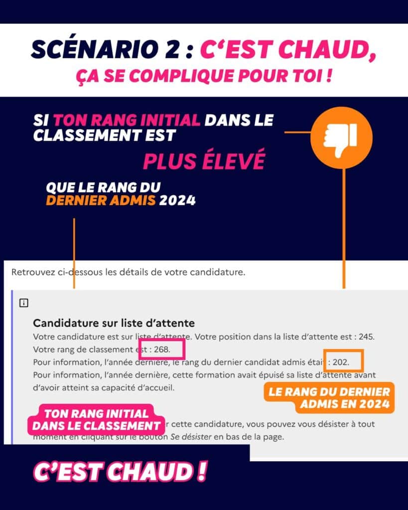 Pour savoir si tu as tes chances d’être admis en liste d’attente, il te suffit de comparer ton rang initial dans le classement avec le rang du dernier admis en 2024.